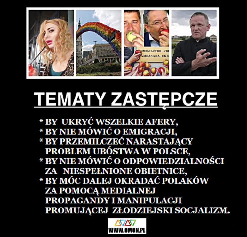 Zasada jest prosta: władza we współdziałaniu z oddanymi jej polskojęzycznymi mediami musi tworzyć i nagłaśniać tematy "zastępcze", które - przy odpowiednim uwypukleniu ich sfery emocjonalnej - będą w stanie całkowicie zająć uwagę milionów odbiorców medialnego przekazu przez kilka, a czasem nawet kilkanaście dni. W ten sposób zmiatane pod dywan (zasłaniane) są tematy naprawdę ważne dla funkcjonowania całego państwa (stan finansów państwa, bezpieczeństwo i obronność, służba zdrowia, bezpieczeństwo energetyczne, nasilenie fiskalizmu), czy też najzwyczajniej w świecie dla władzy niewygodne (afery, korupcja, przekręty). Mam nieodparte wrażenie, że z tym drugim scenariuszem mamy właśnie do czynienia.