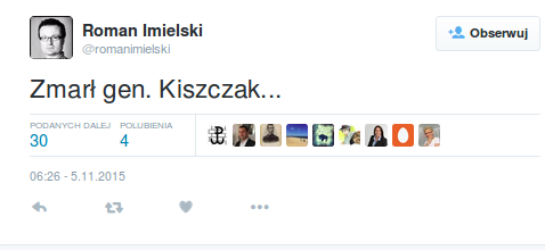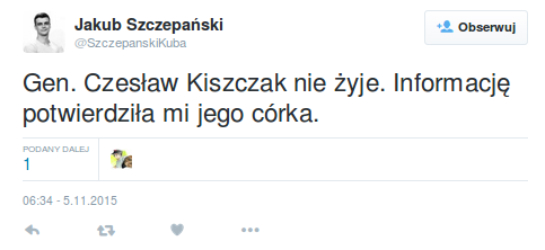Pierwszy informację o śmierci Czesława Kiszczaka zamieścił na Twitterze dziennikarz Roman Imielski.